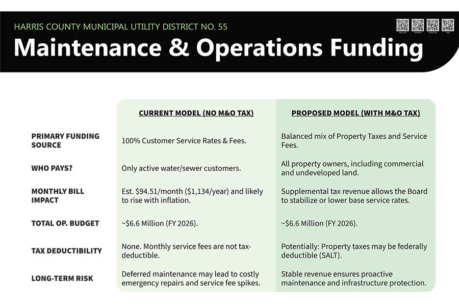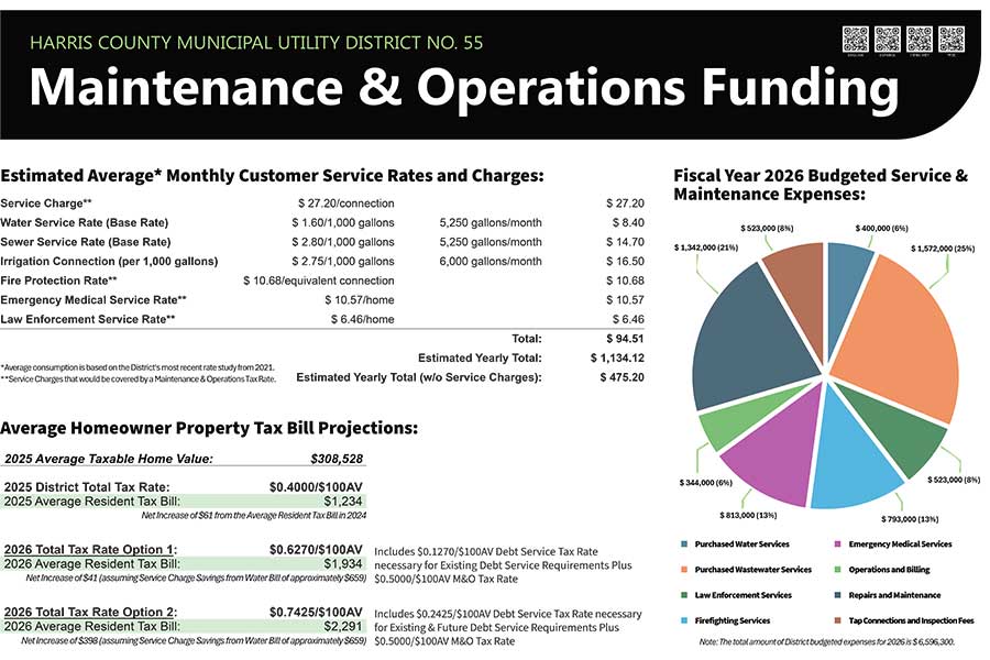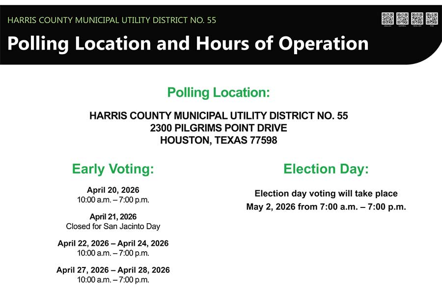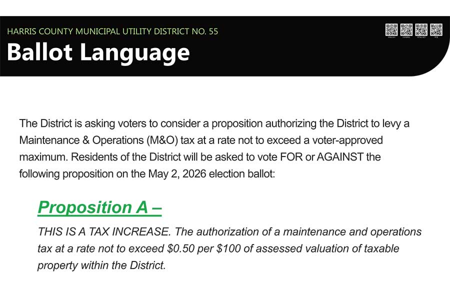 The Harris County Municipal Utility District No. 55 Board of Directors cordially invites you to our Resident Awareness and Educational Open House to discuss the upcoming May 2, 2026 M&O authorization election.